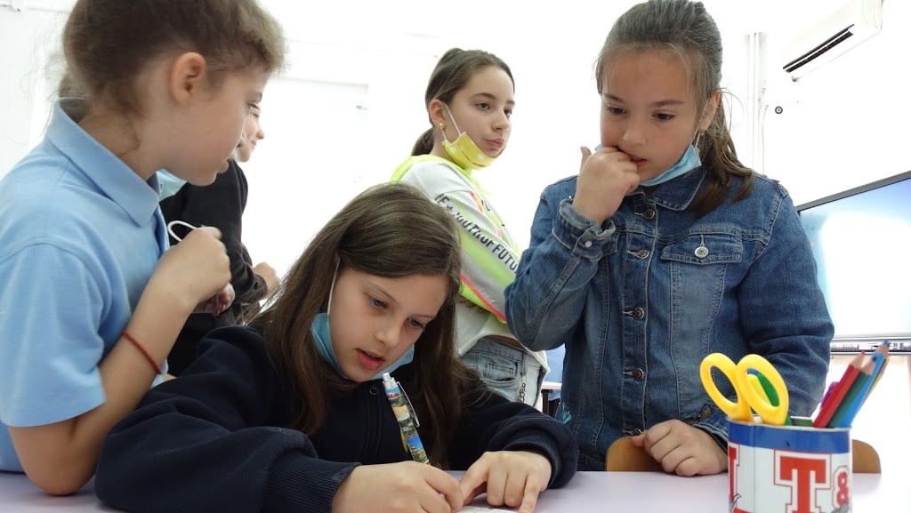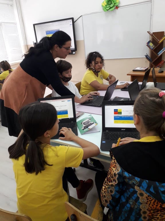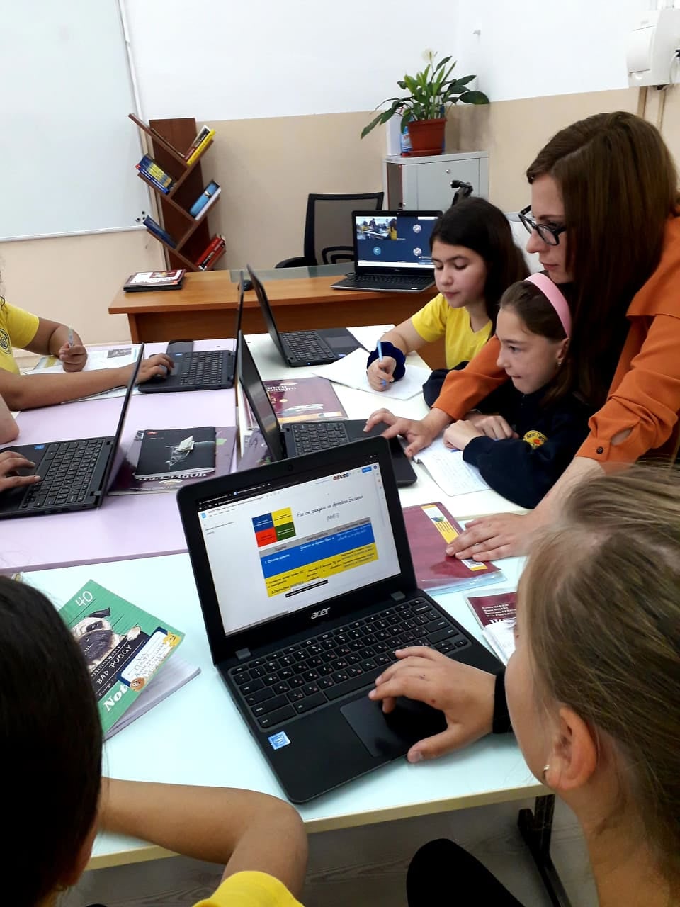 Парадигмата на учене може да се промени с помощта на модела 1:1 (едно към едно). В това ни убедиха учителят в начален етап Калина Даскалова и нейните ученици от 4 в клас, които реализираха урока по човекът и обществото „Ние сме граждани на европейска България“, работейки на персонални Chromebook устройства и използвайки свое копие на документ с всички задачи за часа, включващ връзки с разнообразни материали – ММТS. Попълниха анонимна анкета в Google, дискутираха какво прави Европейският съюз за своите граждани и за планираното осигуряване на безплатен достъп до интернет. Акцент в урока беше и приносът на нашата родина за опазване и обогатяване на културното наследство на голямото ни европейско семейство. Учениците изброиха разнообразни примери за материални и духовни културни ценности и гледаха презентация за българските занаяти, изготвена от групата за занимания по интереси “4web”.