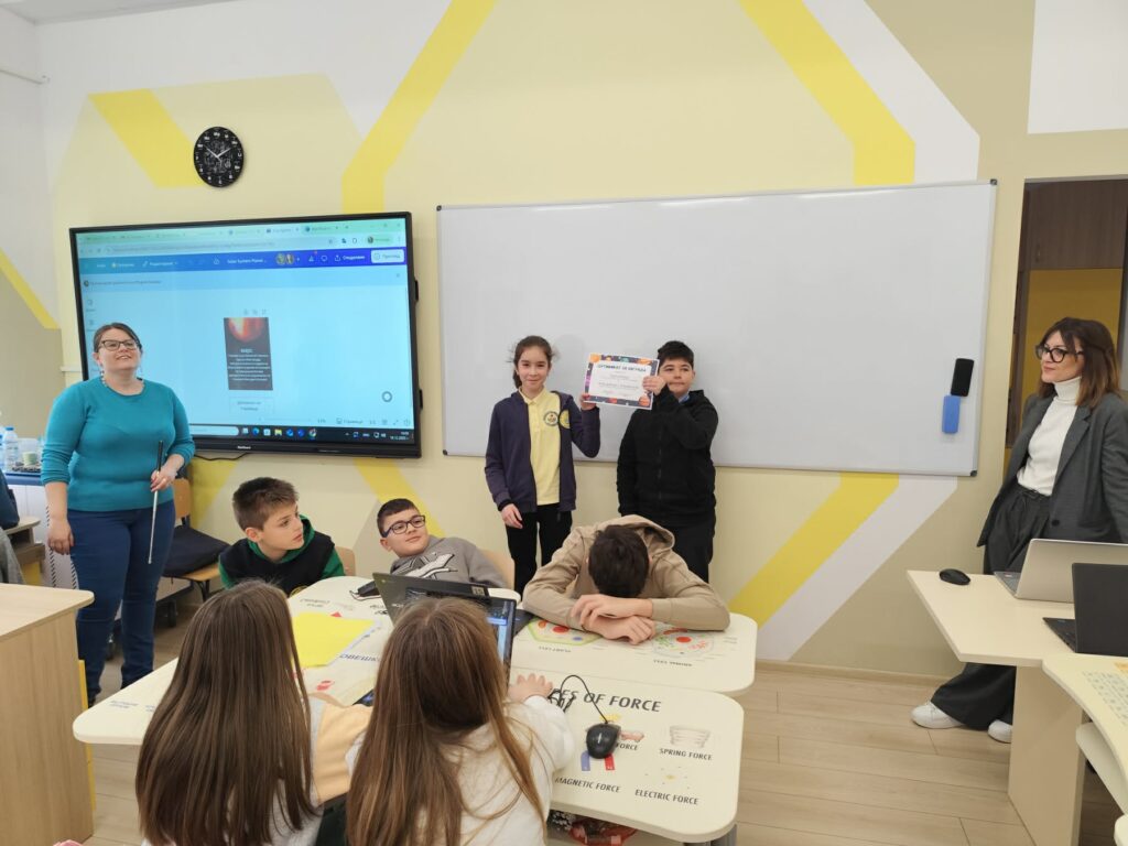 Урокът се проведе във виртуална класна стая, където учениците работиха с добавена реалност (AR). С помощта на интерактивните 3D модели те имаха възможност да „изследват“ планетите отблизо, да използват изкуствен интелект в Canva, за да създадат гатанка за своята планета, изработиха постери с информация за начина на достигане до нея. Накрая всички участници получиха сертификати за своята работа.
