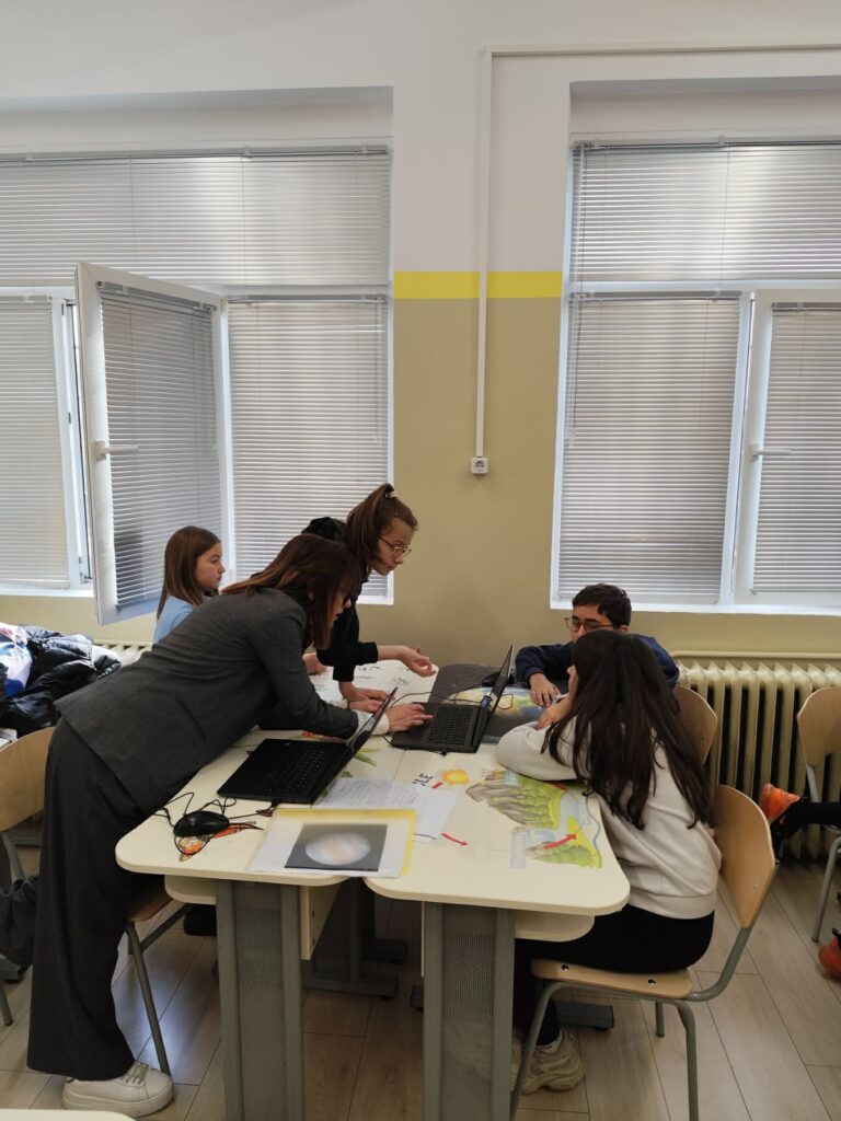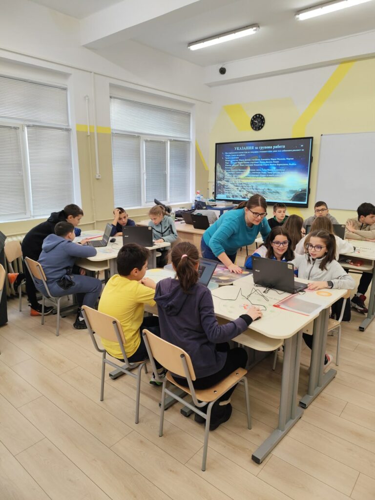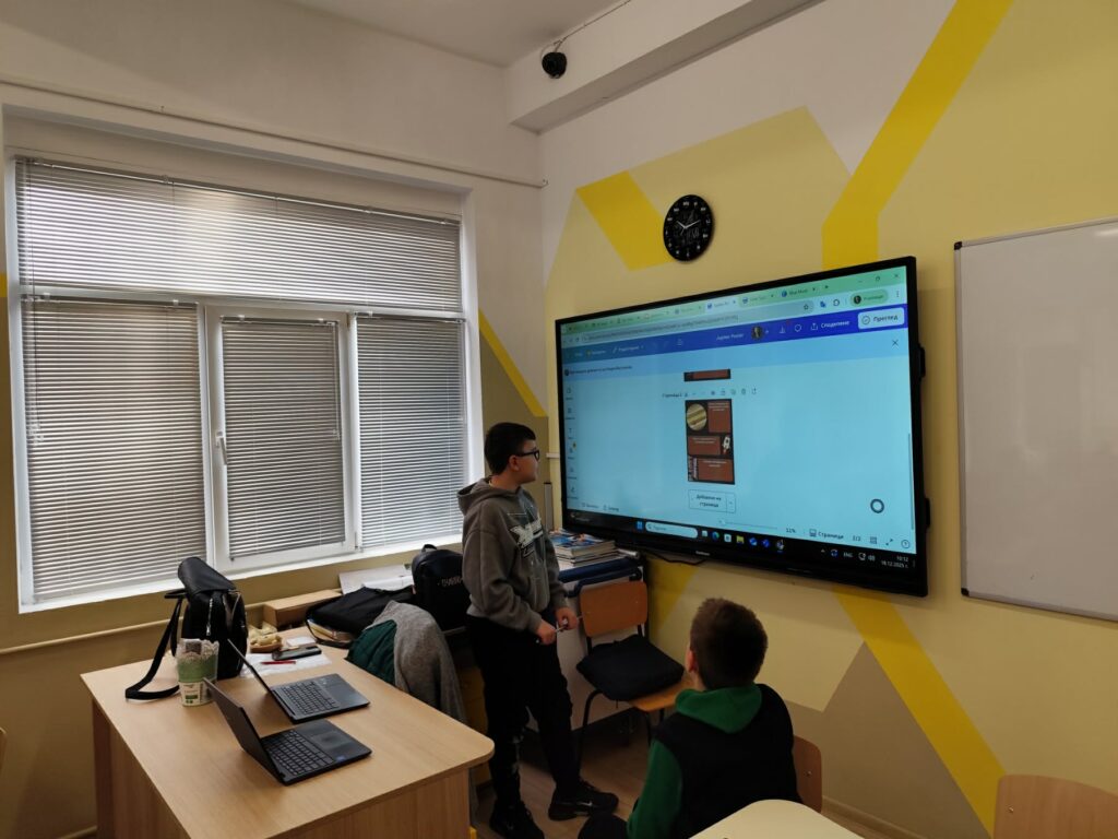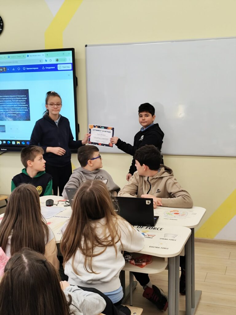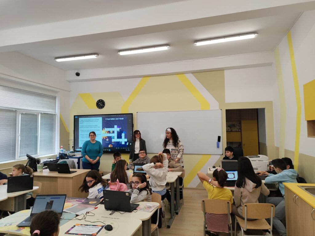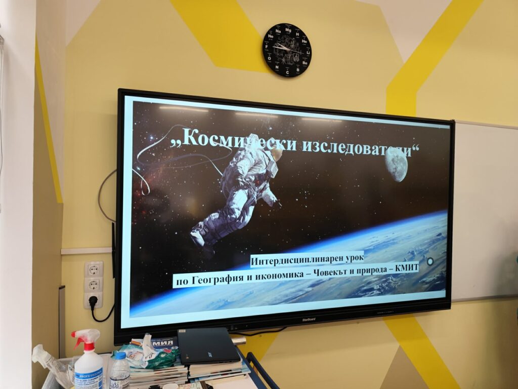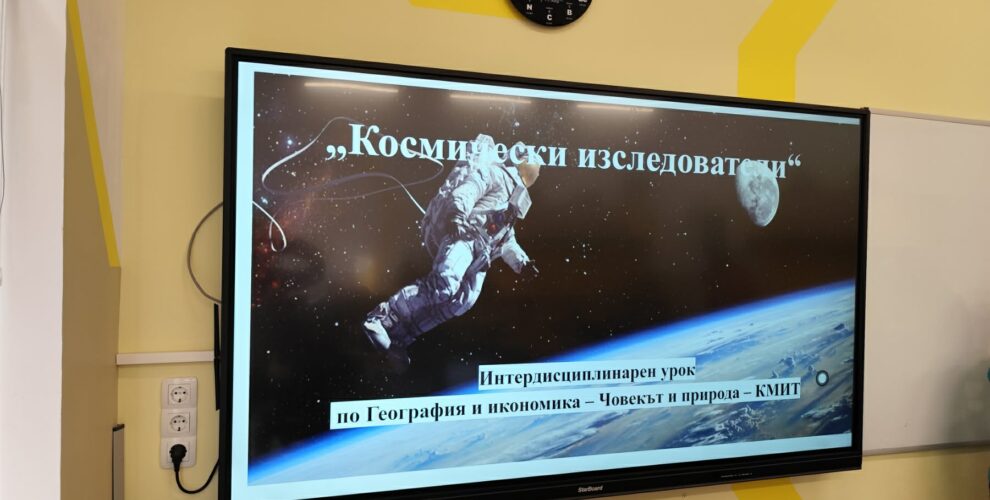 В рамките на интердисциплинарен урок по География и икономика, Човек и природа и Компютърно моделиране и информационни технологии (КМИТ) учениците от 5 “б” клас се впуснаха във вълнуващо пътешествие из Слънчевата система на тема „Космически изследователи“.
