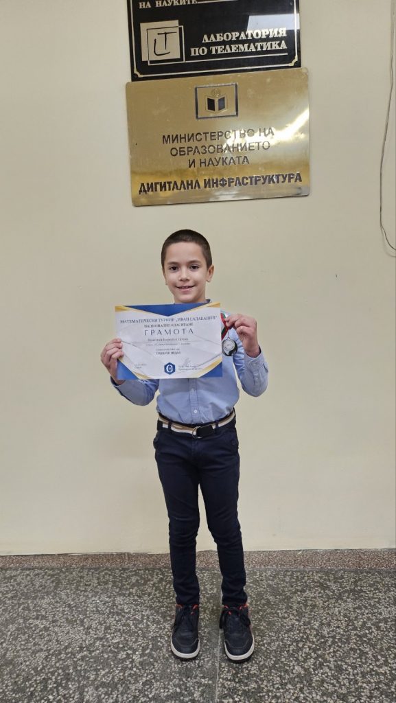 Николай Цочев от 1.А клас спечели почетното ВТОРО МЯСТО и сребърен медал на Националния математически турнир “Иван Салабашев”, организиран от Съюза на математиците в България. За град Пловдив той е класиран на първо място с максимален брой точки.