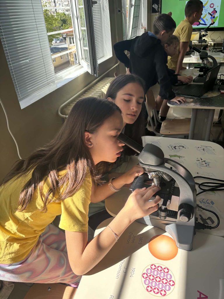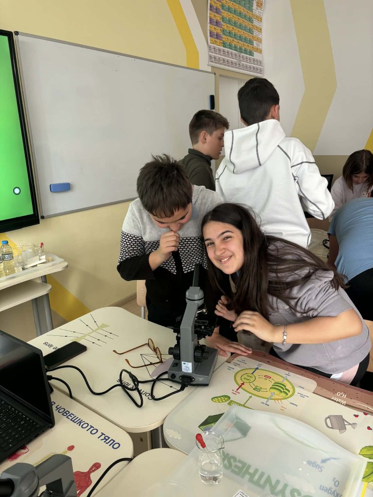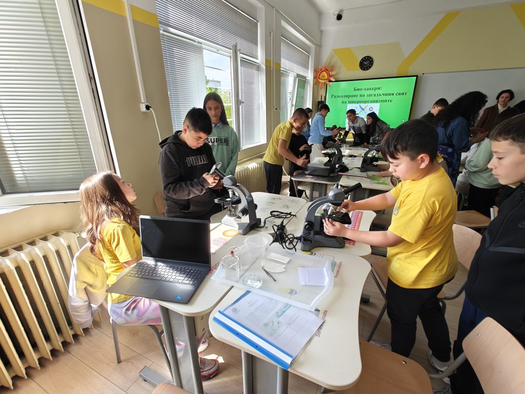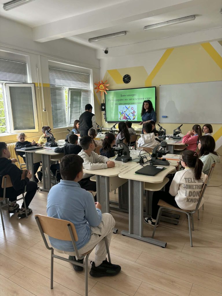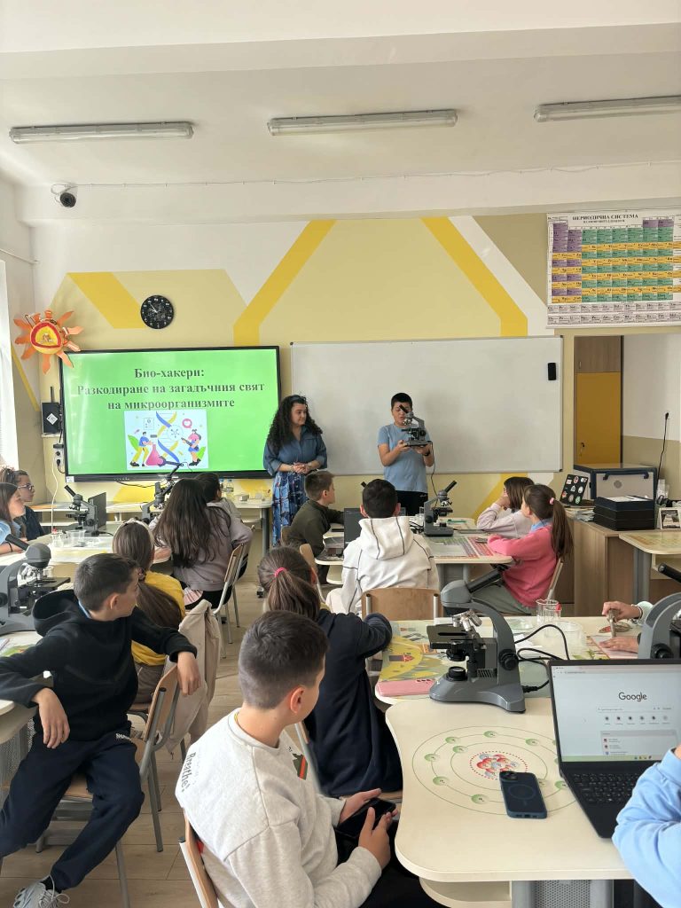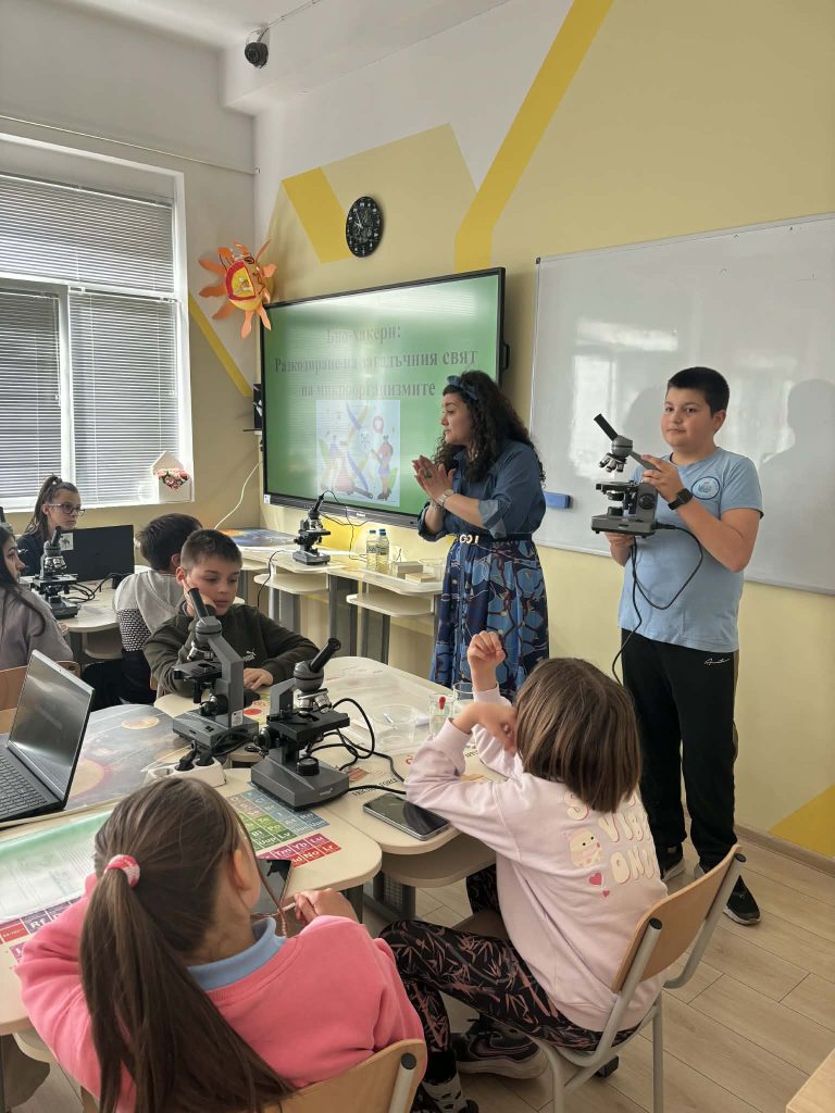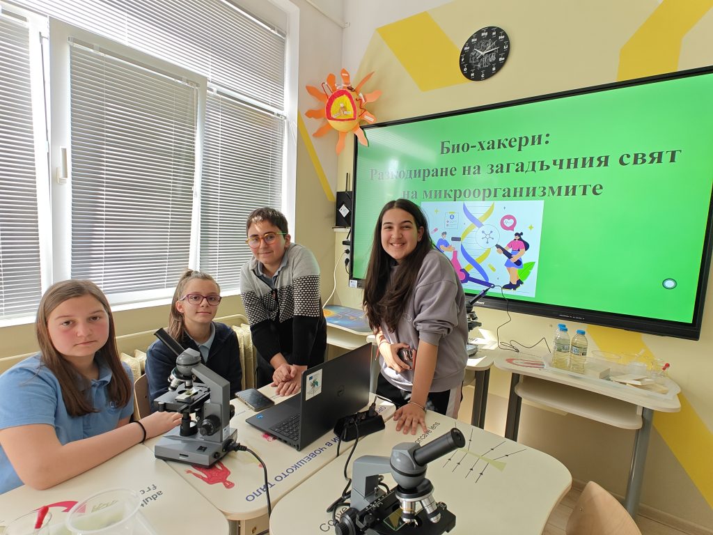 В лаботаторно занимание под името „Биохакери: Разкодиране на загадъчния свят на микроорганизмите“, проведено в STEM пространството по природни науки, петокласниците надникнаха в невидимия свят на клетките. Чрез работа с микроскопи те изследваха и разкодираха структури, невидими за човешкото око. Като истински млади изследователи, те създадоха своя дигитална лабораторна книга, в която събраха наблюденията и откритията си.