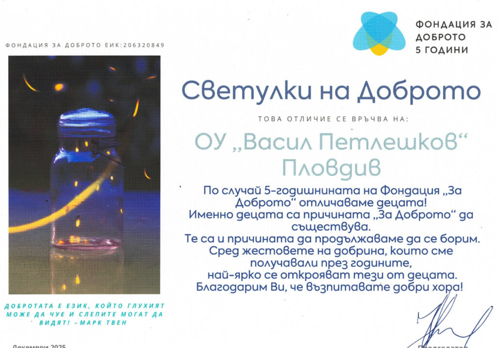 Признателност от Фондация “За доброто” за вклюването и подкрепата на кампанията “Коледно чудо за децата герои”.