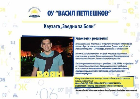 Благотворителна инициатива в помощ на Боян Боянов се проведе на 22 октомври в ОУ „Васил Петлешков“. Съпричастни към каузата на болния от левкемия младеж, деца, родители и учители от учебното заведение в район „Западен“ организираха благотворителен базар, на който бяха изложени ръчно изработени