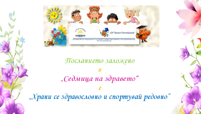 ОУ “Васил Петлешков” участва във Втори общоградски форум “Аз променям моето училище”,  организиран от образователния портал Уча в Пловдив и Община Пловдив. Там бе представена инициативата, проведена през изминалата учебна година за здравословното хранене, под надслов “Храни се здравословно и
